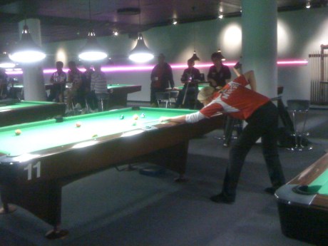We started play friday at 11:30, I had a bye the first round. My bye led me to Monica Webb, my no one bet for winning the tournament. After a rocky first game she played flawless, I lost 6-0, fighting my best but it was not enough. One loss side I met Barbara Bolfelli (ITA) and we had a long match ending 6-5 for me. I had a few really good shots and I had a few really bad ones. But I won, that was the important thing. Last match for the evening to get to the single elimination was against Silvia Gaudino ( ITA). She played the best I have ever seen her play and I just did not get any rolls. Race to six is a short race when nothing is right and 0-6 once more. I really did not play bad at all, I just could not get the balls to roll my way. I am not disappointed with my performance really, I am just disappointed not to get to the single elimination.